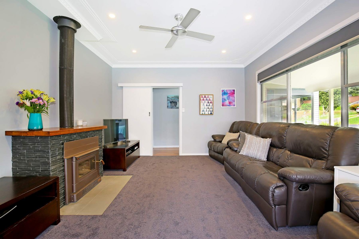 - Lounge room with wood heater