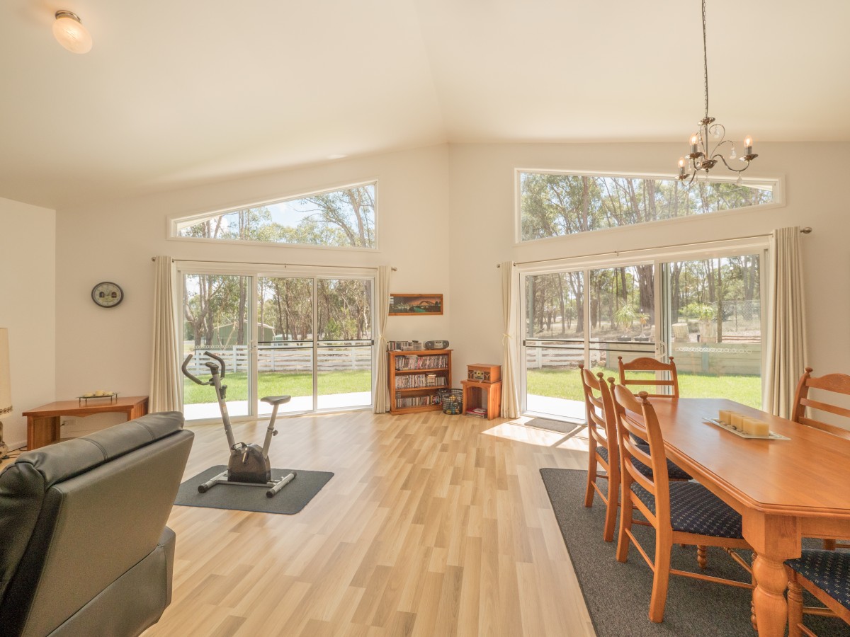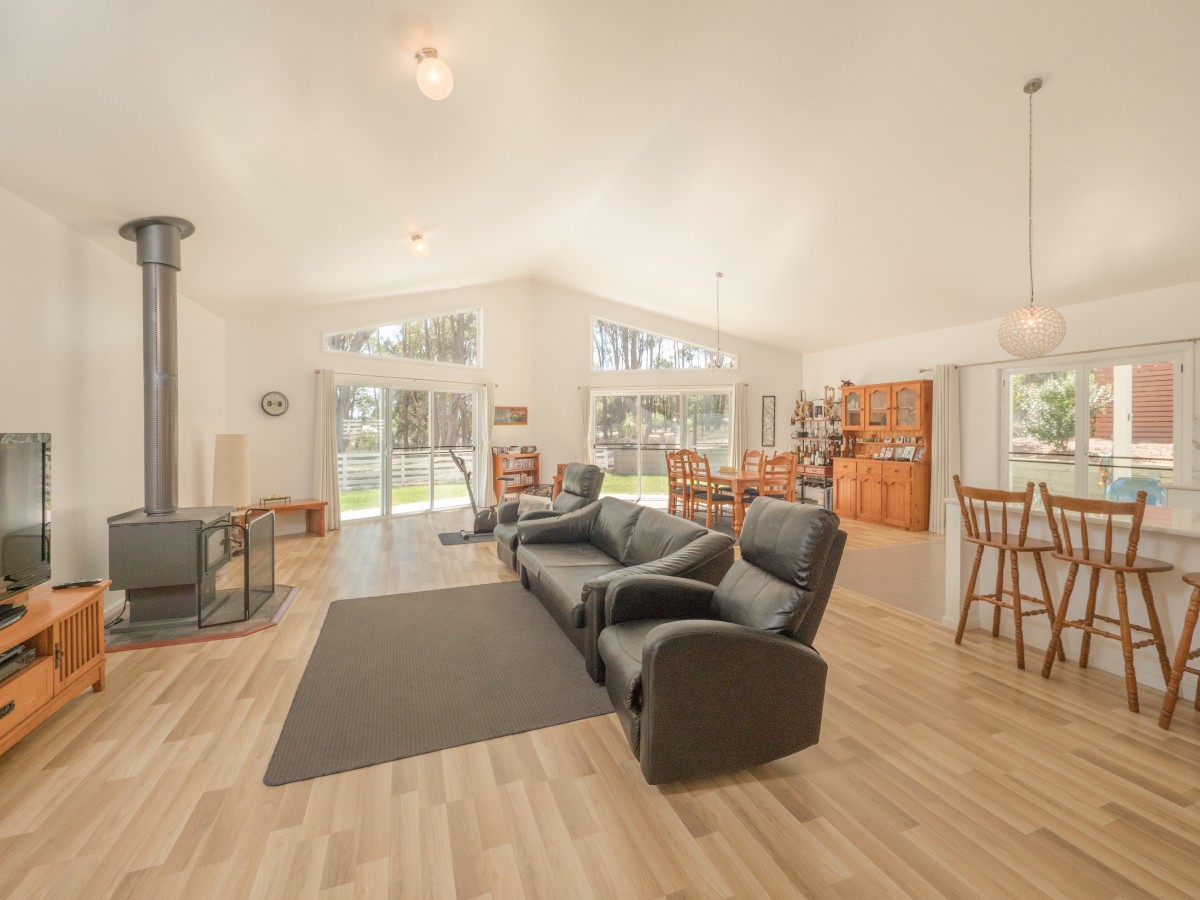 Open plan living/dining with wood heating, featuring a cathedral ceiling & stunning north facing windows allowing for plenty of natural light to shine through creating an inviting space
