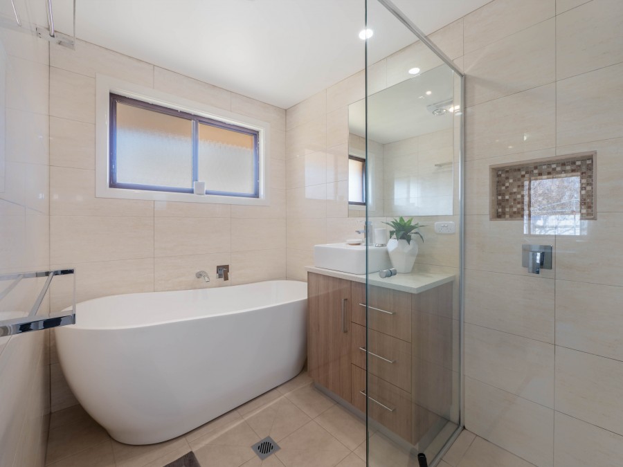 - Stylish renovated bathroom with shower, freestanding bathtub, modern vanity with stone benchtop and tiled from floor to ceiling.