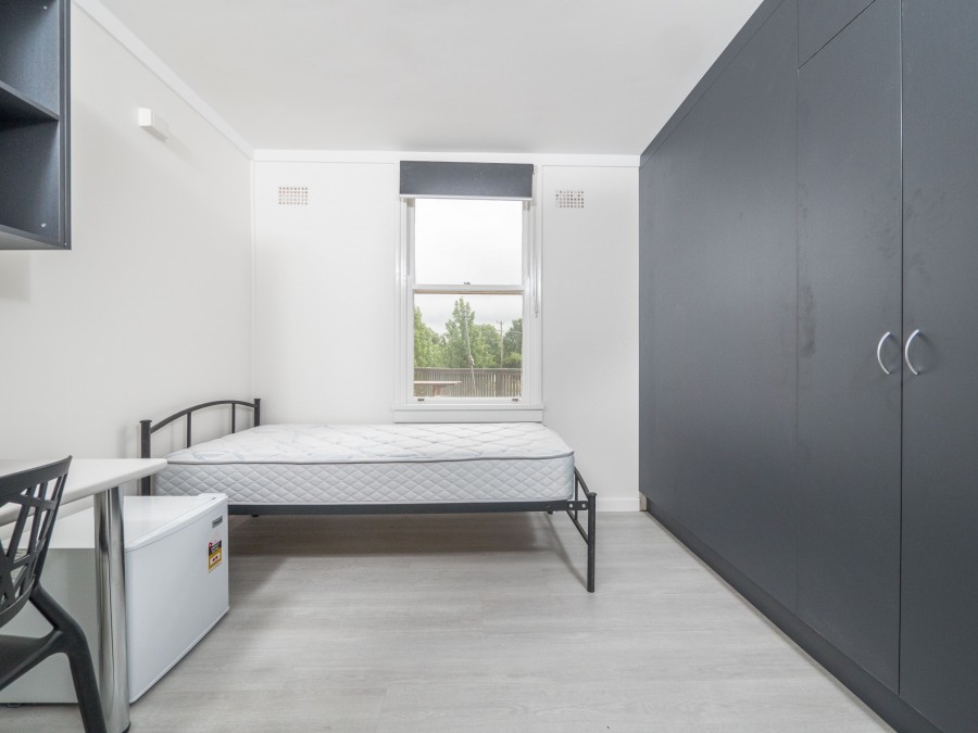 - Renovated furnished room (single bed with mattress, built in wardrobes, desk, chair, small fridge and heater.