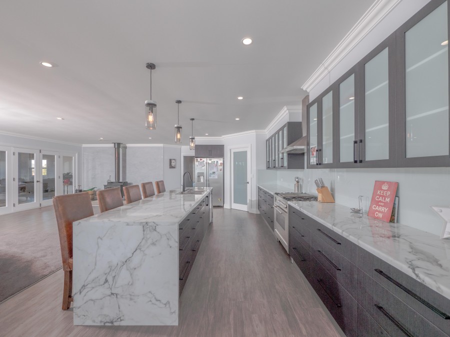 Huge open plan living area with Northern aspect and wood heating