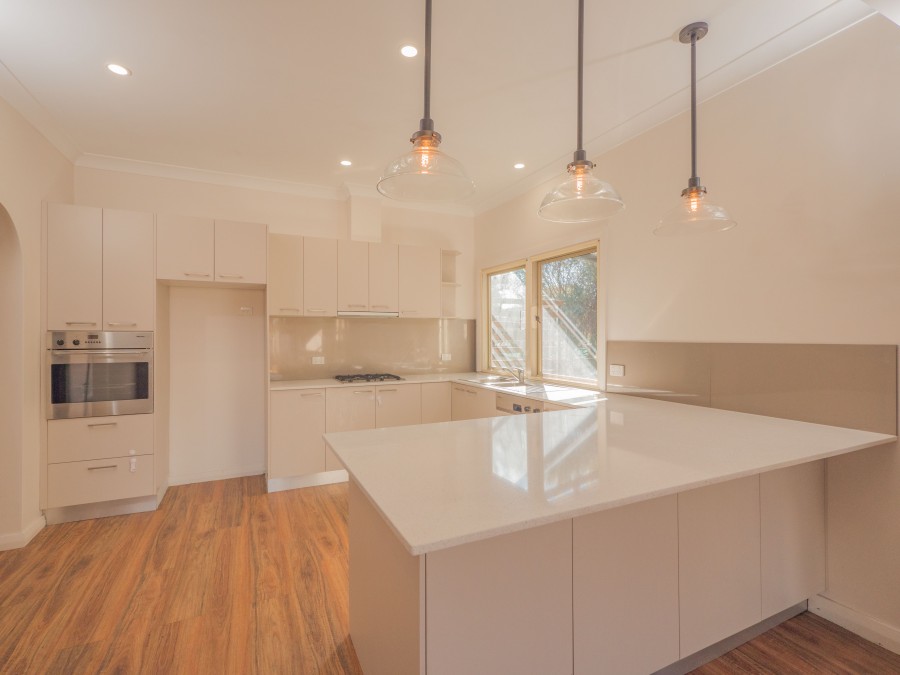Renovated kitchen with stone bench tops and premium stainless steel appliances