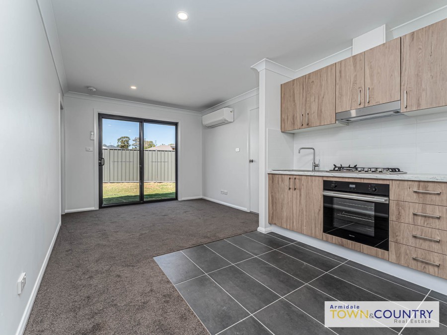 -Open-plan living and kitchen with an air-con unit for heating and cooling.